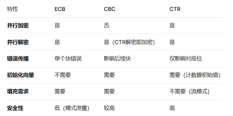 | 优缺点总结 | 优点:简单、并行 缺点:模式暴露、不安全 | 优点:隐藏模式、较安全 缺点:串行、错误传播 | 优点:并行、无需填充 缺点:需唯一nonce |